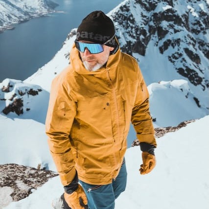 Peak Performance skalljakke for herre i størrelse S. Jakken er tofarget i oransje og gul, med hel glidelås foran og fast hette med stramming. Den har brystlomme med glidelås, sidelommer og lufteglidelåser under ermene. Materialet er et teknisk skallstoff som er egnet som ytterlag i slalombakken eller topptur.
