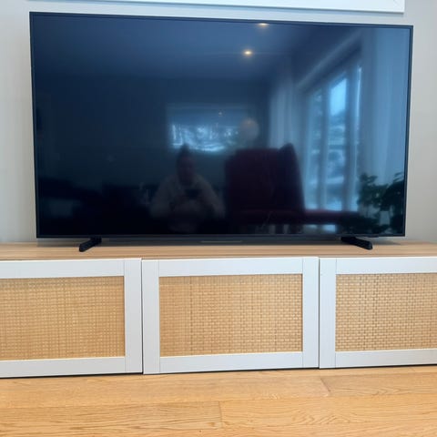 Bestå tv benk i eik og sorte dører. Selges fordi jeg vil ha en annen type. Hel og fin, ingen skader.