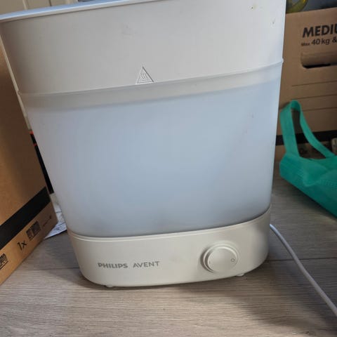 Philips Avent sterilisator for tåteflasker i hvit og blå plast. Enheten består av base med strømtilkobling, avtakbar beholder med perforert innsats for plassering av flasker og utstyr, samt lokk. Sterilisatoren er beregnet for dampsterilisering av tåteflasker, smokker og annet babyutstyr som tåler varme. Passer til bruk på kjøkkenbenk med standard stikkontakt. Egnet for foreldre som ønsker enkel og samlet sterilisering av flere flasker og tilbehør om gangen.