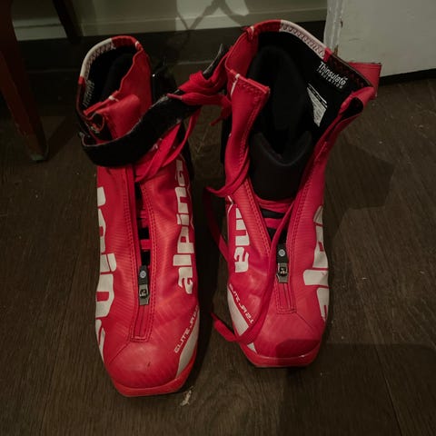 Str 34. Langrennsstøvler i rødfarge. Modellen har snøring foran og høy ankel for ekstra støtte. Passer til bruk på langrennsski. Yttermateriale ser ut til å være syntetisk materiale med trykt mønster. Innvendig fôr gir økt komfort ved bruk.