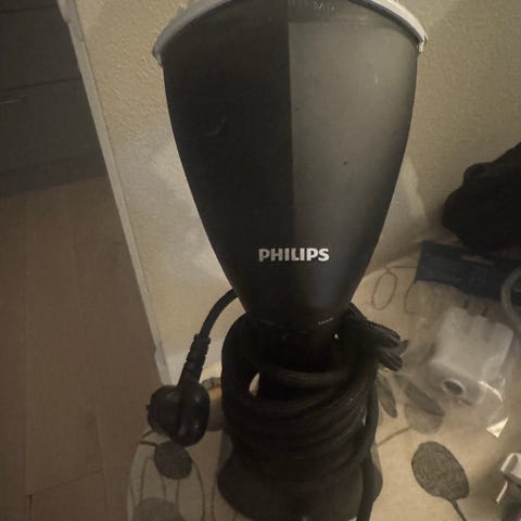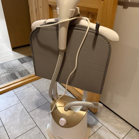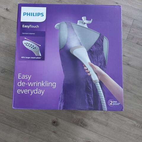 Philips klessteamer for vertikal damping av klær. Enheten har integrert kleshenger og dampplate i plast/metall, samt slange og vannbeholder i foten. Egnet til oppfriskning og utjevning av folder på ulike tekstiler som skjorter, kjoler, bukser og jakker. Kan brukes på hengende plagg og lettere tekstiler som gardiner.