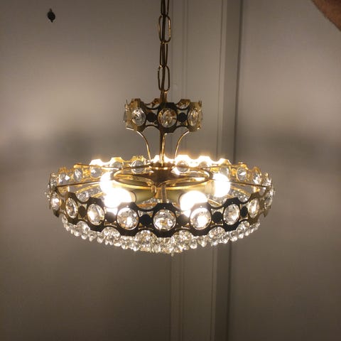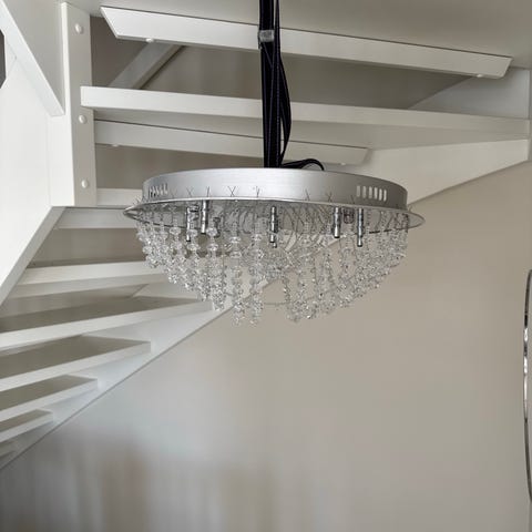 Høyde med oppheng ca 70cm, høyde på lampedelen ca 30cm og diameter ca 39cm.