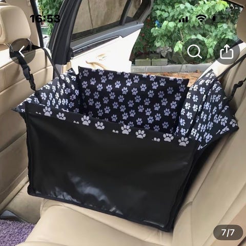 Bilsete som festes med justerbare stropper. Den har innebygd sikkerhetsline som festes til dyrets sele. Sammenleggbar, og har slitesterkt og vannavstøtende materiale. Passer små hunder og katter, vil tro inntil 8-10 kg. (jeg har brukt den et par ganger til hund på 6 kg)