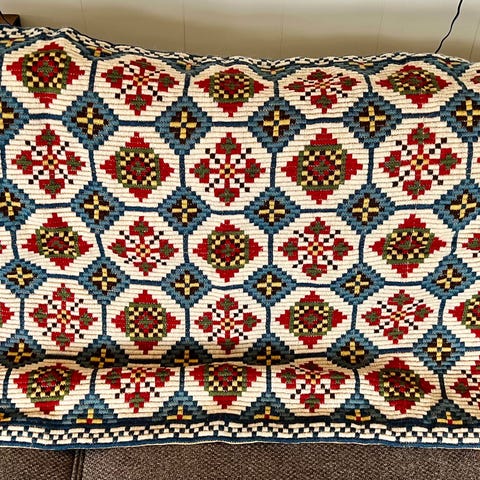 Strikket i trippel mor aase garn! Myye garn og myye arbeid på denne av svigermor! Kun brukt av og på seng i noen år! 2 putetrekk kan følge med