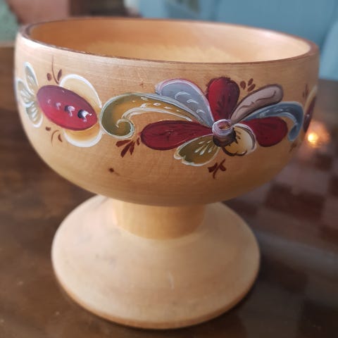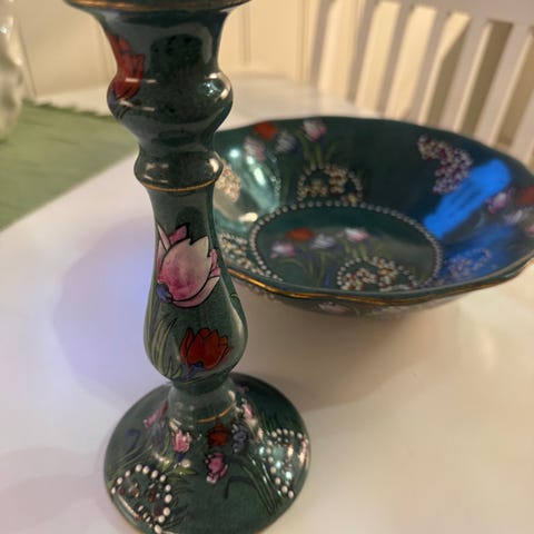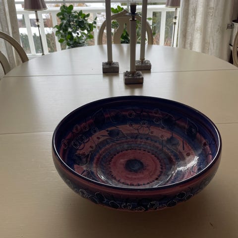Nett liten stetteskål eller fat på stett fra keramikeren Dørje. Signert på undersiden. Dekorert innvendig og utvendig i dus lilla/rosa farge. Høyde 10 cm, diameter ca 13,5 cm. Ingen hakk eller skår.