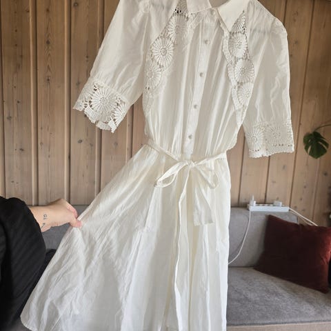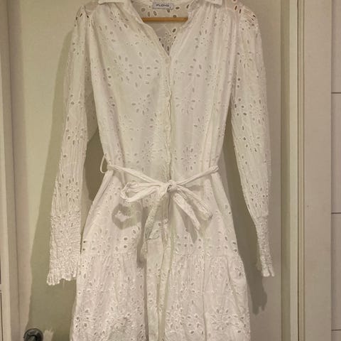 Floyd sommerkjole for dame i størrelse S. Kjolen er hvit og laget i bomull. Den har omslagssnitt med knyting i livet og korte ermer med lett volangkant. Nederst har kjolen volangdetaljer som gir et lett og luftig uttrykk. Egnet til bruk på varme dager, til hverdags eller enkle anledninger.