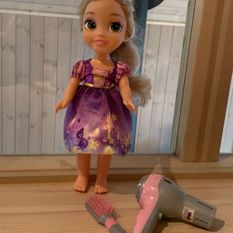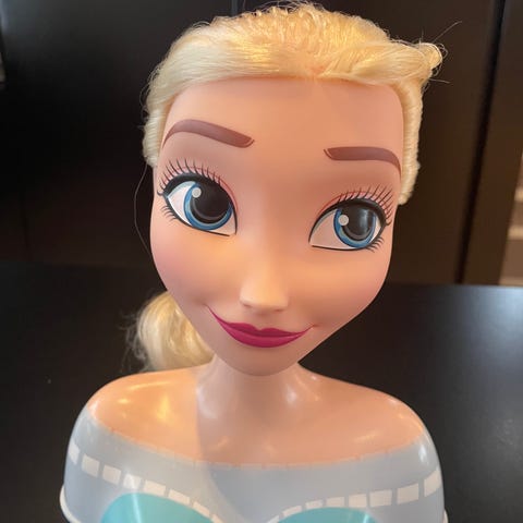 Disney dukkehoder for hårstyling med blondt hår. Bustene viser overkropp og hode med rosa topp og påmalte smykker. Dukkehoder som dette kan brukes til å øve på å gre, sette opp og style hår. Passer som rollelek og frisørlek for barn som liker å ordne hår på dukker.