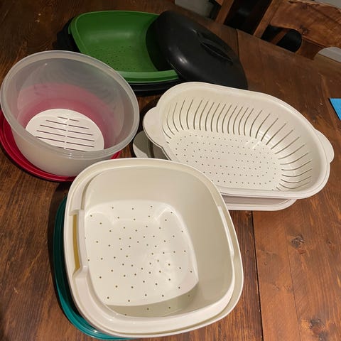 kjøkkenutstyr bestående av ulike gjenstander inkludert plastbeholdere, glass og serveringsfat. Produktene har varierende farger og materialer til bruk i kjøkken og servering.