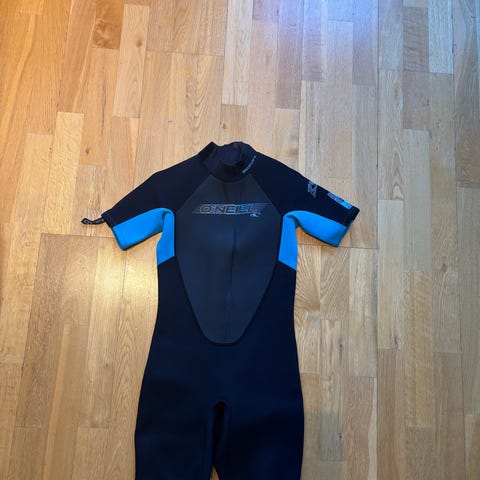 O’Neill våtdrakt for junior i størrelse 14. Passer ifølge lappen til høyde ca. 155–163 cm og brystmål ca. 79–84 cm. Drakten har lange armer og ben, med paneler i svart, grått og neonfarget felt. Glidelås i ryggen. Materiale ifølge lappen består av ulike paneler i polyester, nylon og neopren (ikke-fiberrikt gummi). Egnet til bruk i vannaktiviteter som bading, surfing eller annen vannsport. Vask- og vedlikeholdsinformasjon står på innsydd lapp med symboler for stell og tørk.