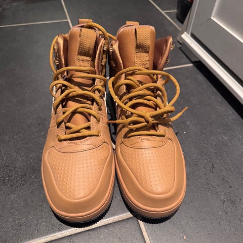 Nike sneakers joggesko i størrelse 42. Modellen er en høy mid-top variant med blå overdel og kontrastfargede lisser. Skoene har gummisåle med Nike-logo og mønster for grep. Egnet som fritidssko og til hverdagsbruk.