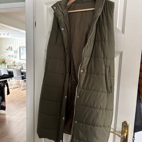 Kjempefin vattert vest for dame i størrelse M. Vesten er hvit med et enkelt, rett snitt. Mer eller mindre ubrukt. Den har høy krage og lukkes foran, med glidelås og trykknapper. Det er to frontlommer med klaff og knapp. Boblevest på utsiden, med myk, pelslignende innside som gir ekstra isolasjon. Egnet som ytterplagg på kjølige dager eller som lag over genser eller genserjakke. Kan sende om ønsket