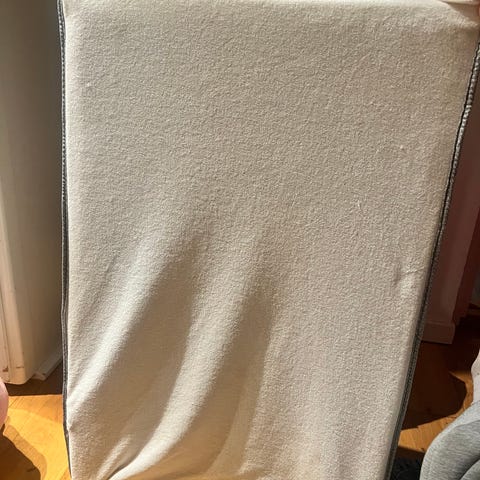 IKEA stellematte i hvit farge. Rektangulær stellepute med opphøyde kanter på tre sider for å gi støtte til barnet under stell. Overflaten er glatt og kan tørkes av med en fuktig klut. Egnet til bruk på stellebord eller annen stabil overflate som tåler fukt og søl.
