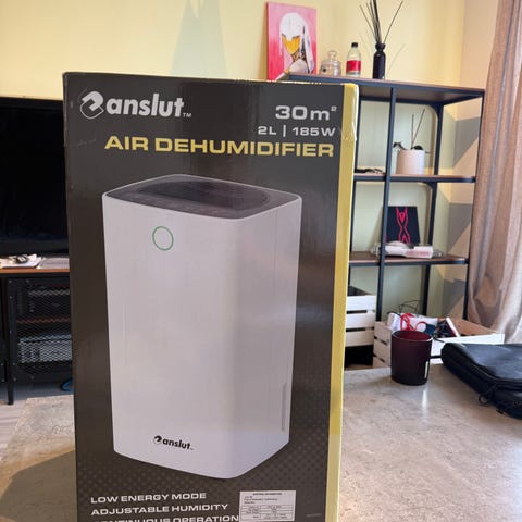 Dehumidifier luftavfukter i svart utførelse. Enheten har toppmontert luftinntak og betjeningsknapper, samt gjennomsiktig vanntank nederst som gjør det enkelt å se vannnivået. Egnet for innendørs bruk i rom der det er behov for å redusere luftfuktighet, for eksempel soverom, stue eller mindre oppholdsrom. Utformet for kontinuerlig avfukting med oppsamling av kondensvann i beholderen som tømmes manuelt. Esken er blitt åpnet, brukt en time. Ny pris kr 2000