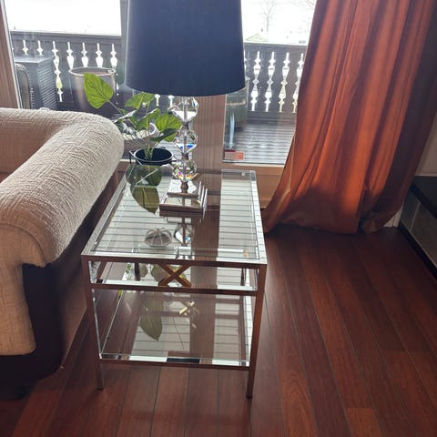 Selger et glassbord til sofa med stålramme, bordet er kjøpt på Falk Møbler i Drammen for en del år siden.