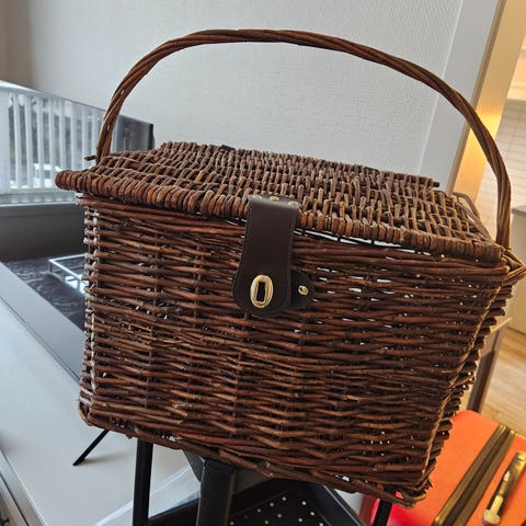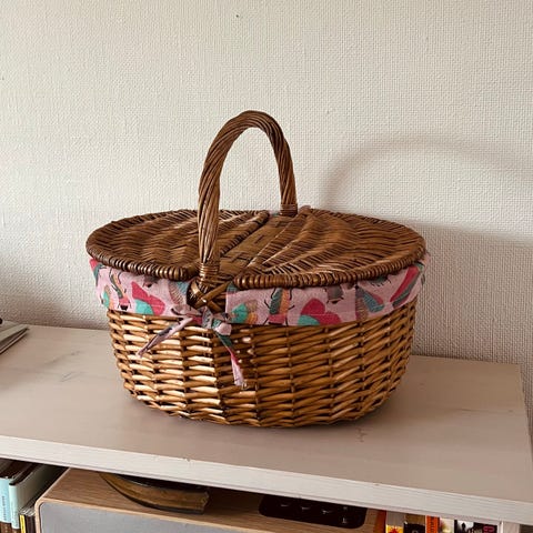 Stor Piknikkurv med håndtak og lokk selges. Nesten ubrukt. Fremstår som ny. God plass til både mat og drikke. Filt på innsiden.