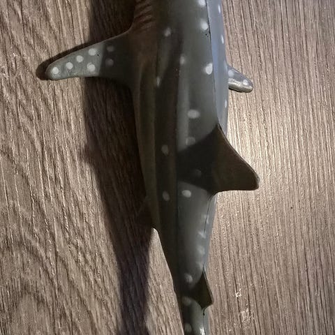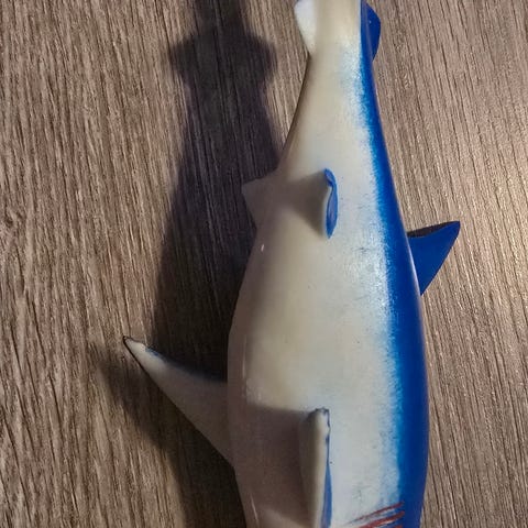 Universal blå hai plastleke i myk plast. Leken forestiller en hai med detaljer på over- og underside. Egnet som figurleke for barn eller som dekorasjon. Produsert i Kina, informasjon er preget inn på undersiden av leken.Leketøyet på bildet er en blåhvalfigur fra Burger Kings "Big Miracle"-serie fra 2012.