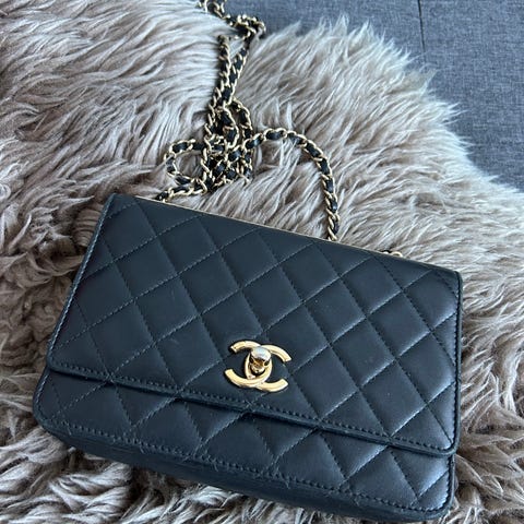 Skulderveske i kunstlær. Må limes litt, men ellers er det masse bruk igjen. Framstår veldig fin på utsiden.