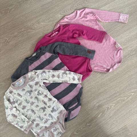Body for baby jente i størrelse 56 og 62. Pakken inneholder 12 langermede bodyer i ulike flerfargede varianter, som vist på bildene. Bodyene har trykknapper i skrittet for enkel av- og påkledning. Passer til hverdagsbruk for spedbarn. De fleste av dem ubrukte. 9 bodyer størrelse 56 og 3 bodyer størrelse 62.