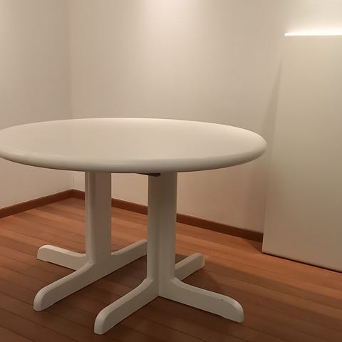 Bordet har en diameter på 108 cm, men følger med en ileggsplate (ligger lagret under bordplaten).