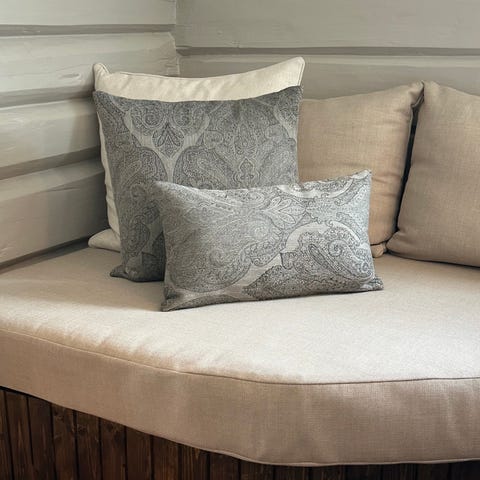 1 hvit pyntepute og en avlang pyntepute med blå stripe i lin aktig stoff.