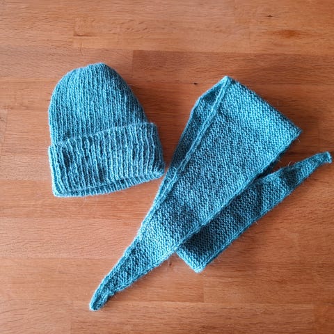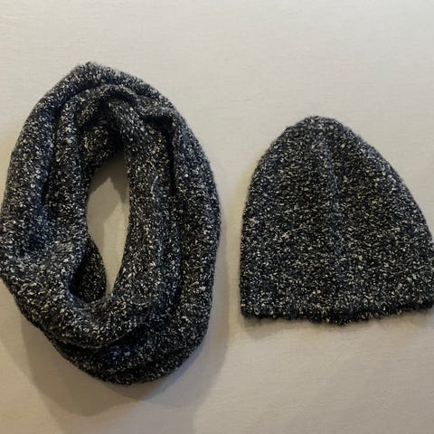 Lue strikket med dusk, one cize. Rundt skjerf strikket. Farge sort med hvite spetter. Kjøpt på Kappahl. Selges samlet.