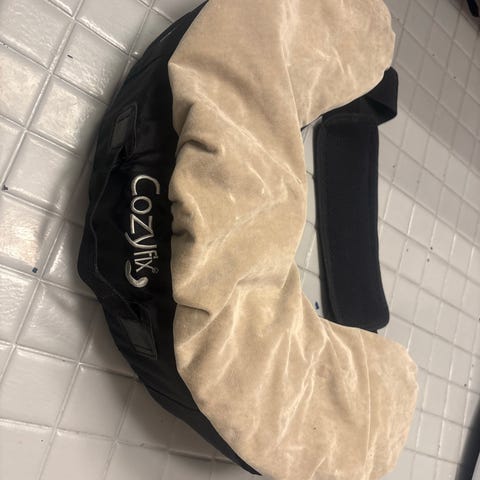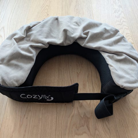 Cozyfix ammepute i beige tekstil. Puten festes rundt livet med justerbar stropp og klips. Utformet for å gi støtte ved amming eller flaskemating ved at barnet kan ligge stabilt på puten. Trekket er av mykt stoff, og puten har polstret kjerne for komfort. Egnet til bruk i stol, sofa eller lignende sitteposisjon der man ønsker ekstra støtte under mating. Lappene ved festene har fått litt løse tråder etter vask (se bilder) men har ingenting å si for bruken.