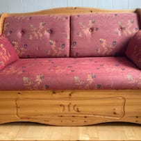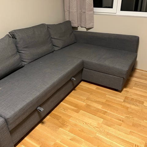Sovesofa: Godt brukt sovesofa med flere slitasjer - se bilder. Trekket til sovesofaen kan tas av og trekkes om - men går fint an til å brukes som sofa og sovesofa.