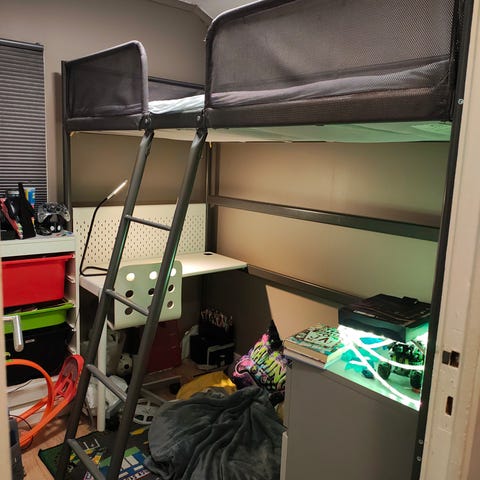 Fint brukt loftseng med skrivebord til salgs. Stigen er montert på venstre side , kan også monteres på høyre side. H: 186cm B: 140cm med stige og 100cm uten stige. Madrassmål 90x200cm.