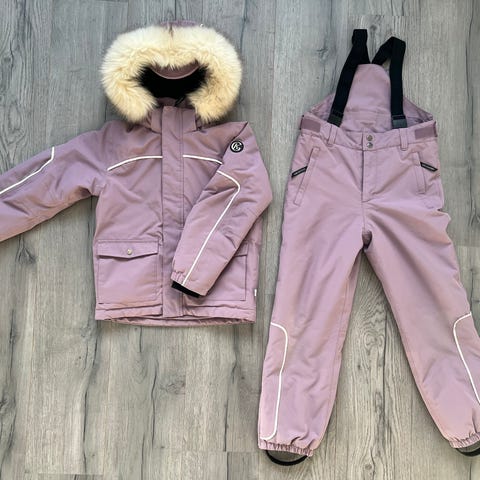 Nydelig dus rosa farge. Gullkorn supre kvalitet. Litt slitt her og der, men mye bruk igjen. Ca. 2500,- nytt. Str. 140. Avtakbar hette og pels på jakka. Avtakbar sele på buksa.