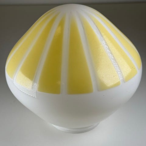 Lampen er utført i amberfarget plexiglass med fasettslipte kanter og dekorativt stjernemotiv. Messingstenger med kuleavslutninger gir et typisk og eksklusivt 70-talls uttrykk.