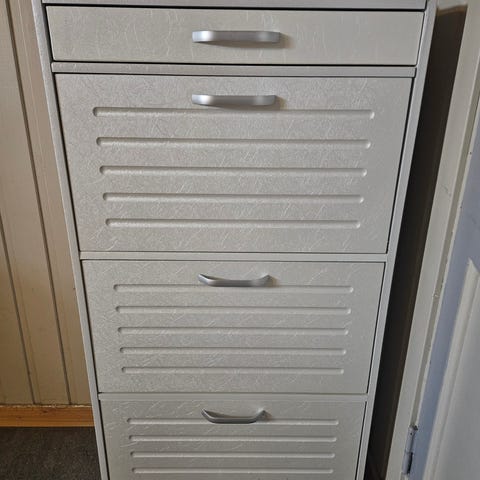 Pent brukt, stødig og solid skoskap fra Jysk (Bakhuse) uten særlige bruksmerker eller slitasje. Masse plass, hylle i hver skuff som kan justeres eller fjernes avhengig av størrelse på sko.