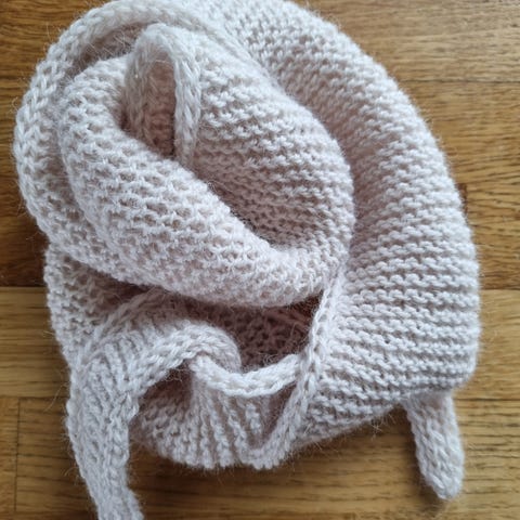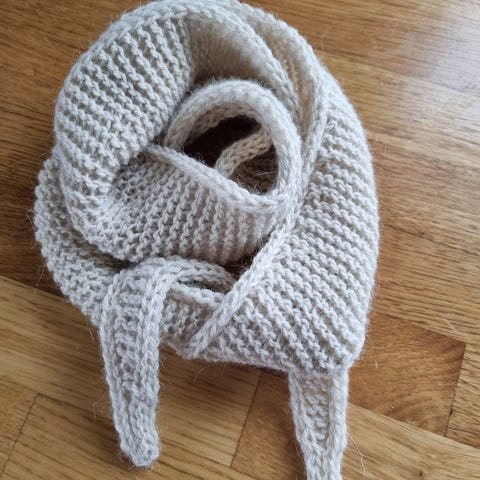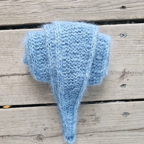 Håndstrikket med sidetråd av kid Silk , resultatet blir myk og behagelig å ha rundt halsen . 100 cm langt x 12 cm bredd (i midten)