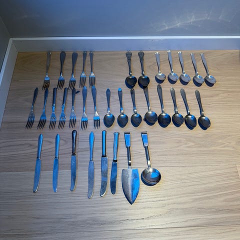 Settet inneholder deler tilpasset en formell borddekking, inkludert gafler, skjeer og kniver.