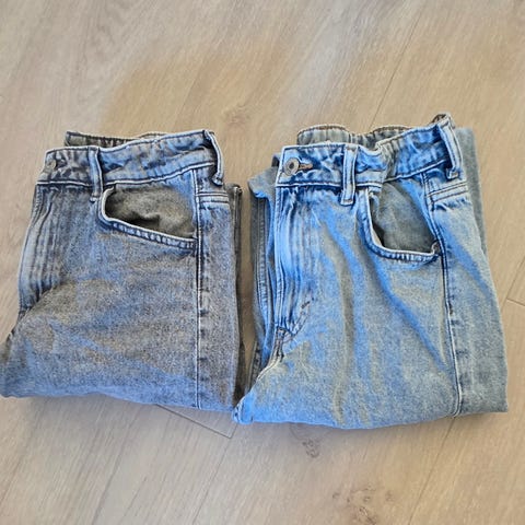 To kule olabukser. En sjakkrutet olabukse og en lys olabukse med hull på kne og snitt i enden. Begge vide. Selges samlet
