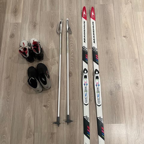Skiene er klassiske langrennski med feller under midtpartiet. Ett par er 100 cm og ett par på 110 cm (SOLGT) Stavane er 80 cm og 85 cm (SOLGT).