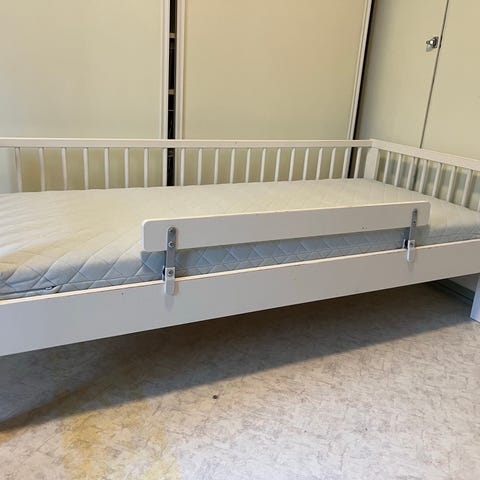 IKEA juniorseng i hvit utførelse med sengehest på siden. Sengen har hodegavl med utskårne detaljer og lave ben som gjør den egnet for barn som har vokst ut av sprinkelseng.
