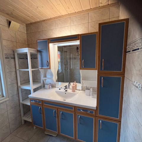 (RESERVERT) Foss Bad. Baderomsinnredning med servantskap, speil og overskap