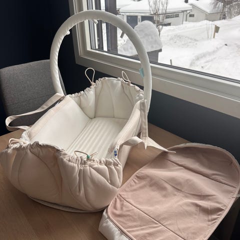 Najell SleepCarrier X babynest i beige farge. Babynestet kan brukes som bærebag og soveplass for baby. Det har bærehåndtak og polstret liggeflate. Yttermaterialet er tekstil, og kantene kan strammes med snor for å justere formen rundt barnet. Egnet til bruk i barnevogn, på gulv eller andre stabile flater der barnet skal hvile. Detaljbilde viser noe bruksspor på stoffet.