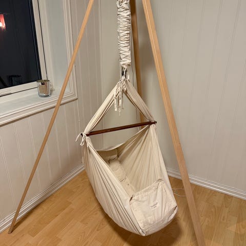 Hengekøye, motor, stativ, karmbeslag (så man ka henge vuggen i døråpninger etc. ) og sengehimmel.