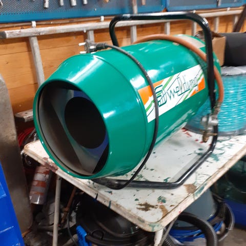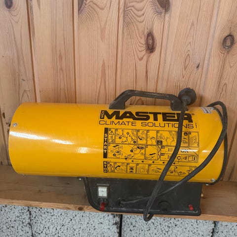 Master Climate Solutions gassvarmer med tilkoblet propanflaske. Bærbar varmekanon med håndtak på toppen og elektrisk tilkobling via kabel og støpsel. Enheten er koblet til en stående propanflaske med slange og regulator. Egnet til oppvarming av godt ventilerte områder som garasje, verksted eller byggeplass, der brukeren har behov for midlertidig varme fra gassdrevet varmer.