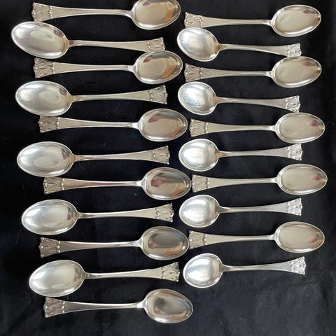 8 stk is-/barneskjeer, 14 stk kaffeskjeer, ikke brukt, ikke pusset.