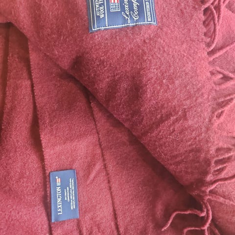 Selger ubrukt rødt ullpledd fra kid. Pleddet er 130 x 170 cm.