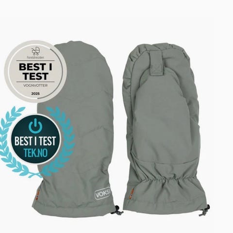 Voksi vognvotter i fargen sand. Ytterstoff med imitert pelskant og mykt, pelslignende fôr på innsiden. Vottene festes rundt vognhåndtaket med trykknapper. Egnet for bruk på barnevogn for å holde hendene varme i kaldt vær.