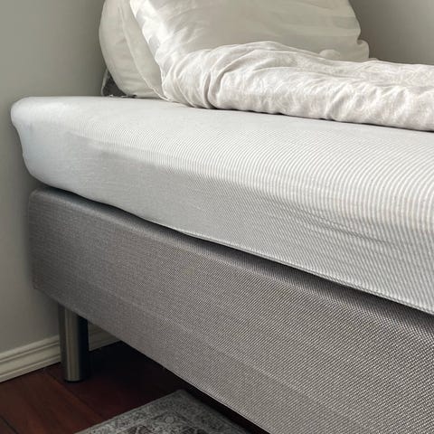 IKEA seng med overmadrass som kan vaskes. Beina på senga er 20 cm, slik at man under kan oppbevare som ekstra lagringsplass med esker o.l