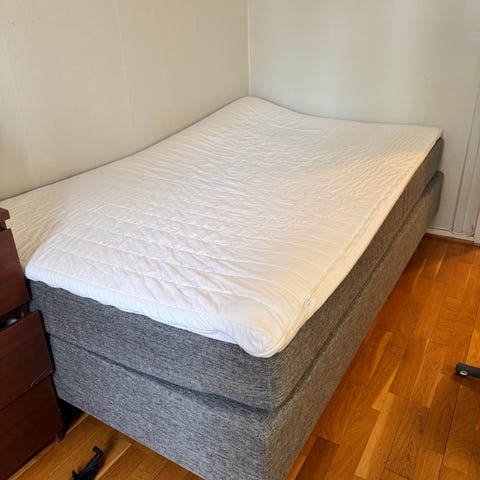 Sengen har en enkel ramme med polstret trekk, og det følger med en overmadrass som kan tas av. Passer som enkeltseng eller dagseng/gjesteseng. Nøytral, lys tekstilfarge som gjør den enkel å kombinere med annet interiør. Egnet for bruk på soverom, gjesterom eller som ekstra soveplass.