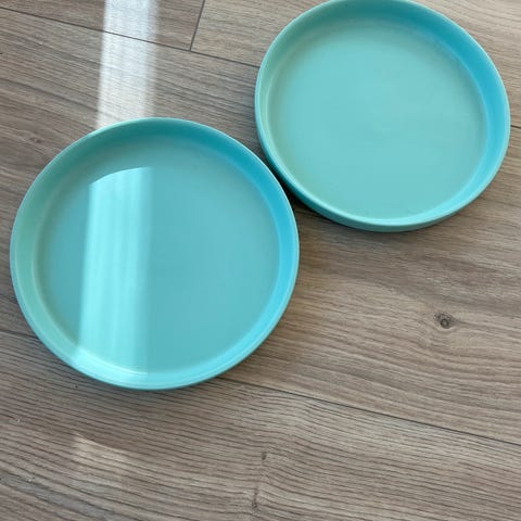 Hay Kaleido brett sett sekskantet i metall i fargene rosa og lys blå. Settet består av to geometriske brett i ulik størrelse, ett dypere rosa brett og ett større, flatere lys mint farget brett. Brettene kan brukes hver for seg eller sammen til oppbevaring av småting, servering av tørre varer eller som dekorative elementer på bord, hylle eller kommode.