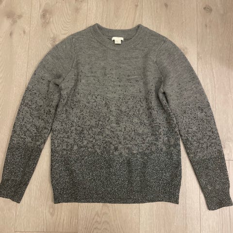 Aldri brukt. Søt topp/genser fra H&M genser i størrelse XS. Søte puffermer. Genseren er sølvfarget med lange ermer og rund hals. Materialet er hovedsakelig polyester, som gir et lett og glatt uttrykk. Passer til hverdagsbruk eller fest. Pynt opp eller ned.