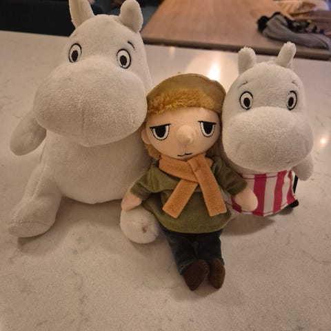 Mummi kosedyr med figurene Lille My og Hufsa. Begge er myke stoffdyr i tekstil. Lille My har rød kjole, oransje hår og sorte detaljer, mens Hufsa er grå med sorte poter og broderte ansiktstrekk. Egner seg som lekekosedyr eller pyntegjenstand for barn som liker Mummi-universet.