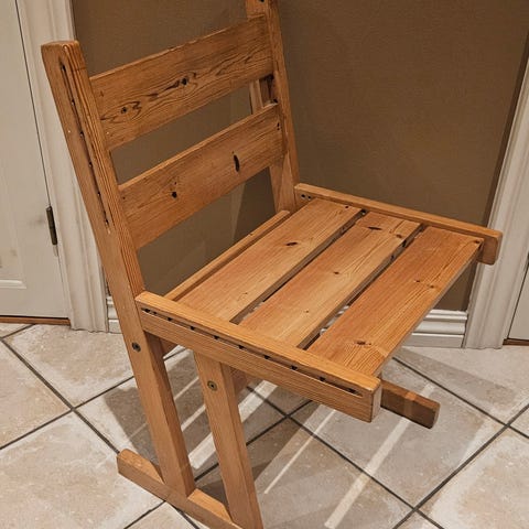 Solide heltre spisestuestoler i furu laget av møbelsnekker. Stolene har rett rygg med utskåret dekor i ryggen og enkle, rette ben. Sittehøyde 44 cm. Egner seg som spisestuestoler eller ekstra sitteplasser på kjøkken eller i stue. Navnet «K. Aulie» signert i treverket på undersiden av setet på stolene.
