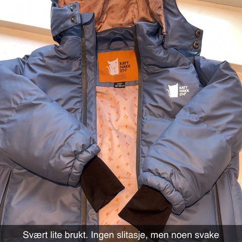 Kattnakken jakke str 7/8 ☺️ tror den heter bobleregnkåpe sludd. pent brukt men noe misfarging på armene og andre steder, og en liten rift på ryggen. Har ikke hatt noe å si for bruken her. Men derfor den selges billig.